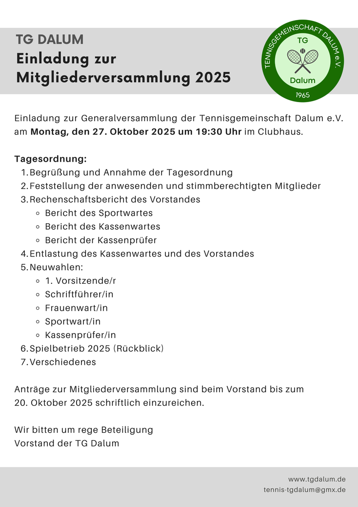 Wer hat Interesse an einem Newsletter der TG-Dalum und möchte immer aktuell über das Vereinsgeschehen informiert werden?
